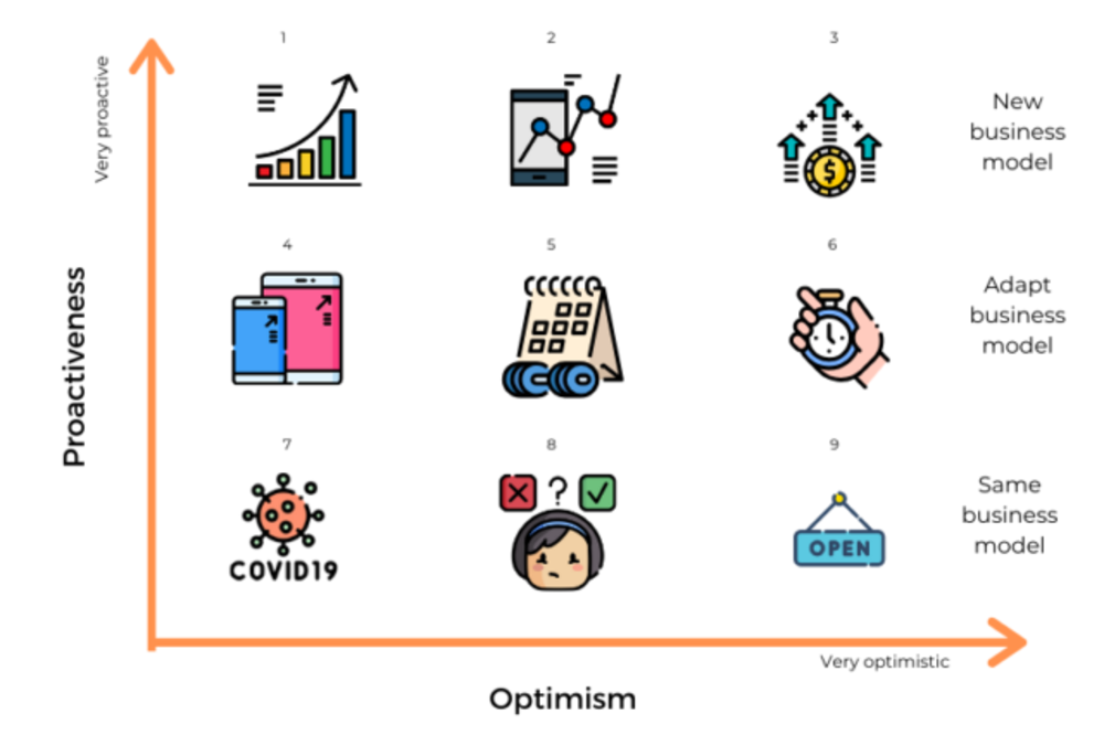On the y line we have “proactiveness”. This axis highlights how entrepreneurial you are during this time. Do you see yourself moving into the online space or other business models? Are you absorbing competition? Are you not thinking about the consequences of COVID-19 at all?