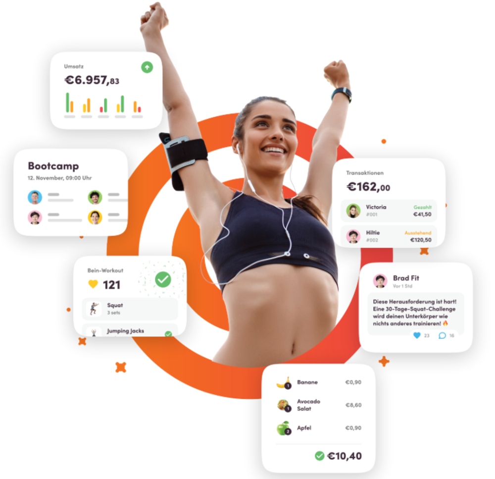 - Eine Plattform, die Buchungen, Zahlungen, Workouts, Fortschritt und Kommunikation bündelt