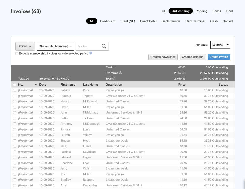 En esta vista filtrada, Tom vio las primeras y recurrentes facturas que se enviaron a GoCardless y pudo comprobar las excepciones. Todos los pagos recurrentes se enviaban a GoCardless para que el pago pudiera ser procesado. Una vez que se procesaba un pago, se actualizaba automáticamente en el portal de Virtuagym de Tom.