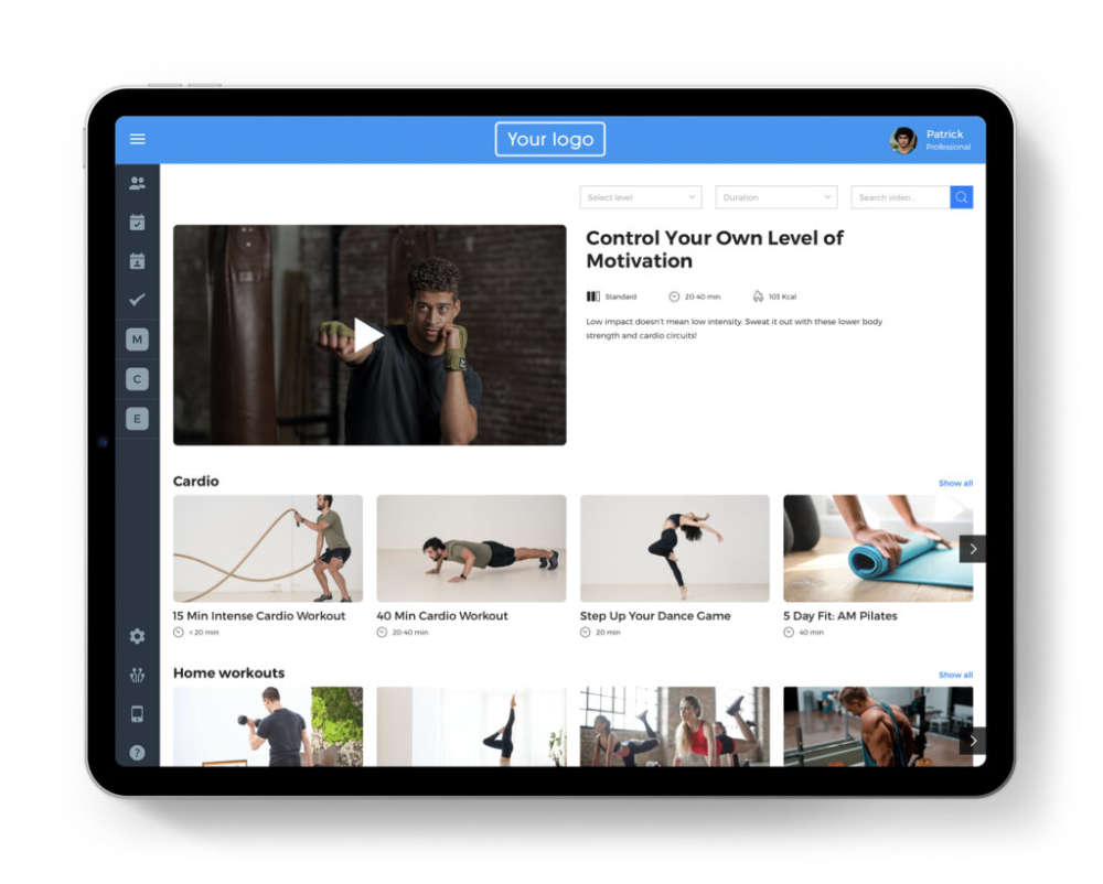 Esta es una solución clave de entrenamiento y compromiso online. Una vez que se habilite el VOD, sus clientes podrán ver “Videos on Demand” en el menú de la barra lateral izquierda de la web, o como un recuadro en la pantalla de inicio personalizada de su aplicación móvil.