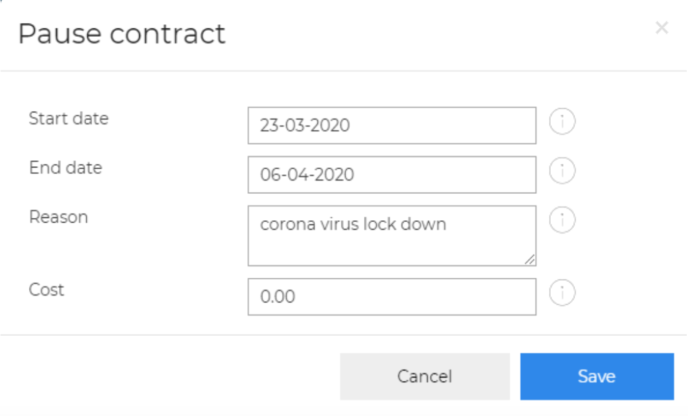 - La pausa siempre debe tener una fecha de finalización. Si el contrato necesita ser pausado por más tiempo después del período inicial, agrega una pausa extra a partir de la fecha de finalización.