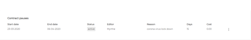 Después de esto, se puede ver que la suspensión ha sido añadida, junto con el número de días de la suspensión y el coste. Además, el estado del contrato cambiará de “Activo” a “Pausado”.