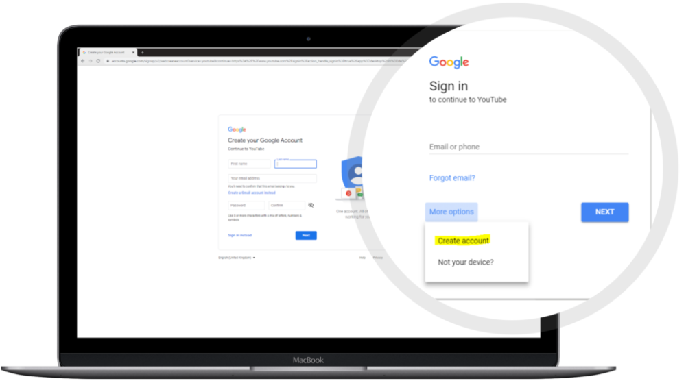 - Cliquez sur Créer un compte - si vous avez déjà un compte Google (par exemple sur Gmail), vous pouvez choisir de vous connecter à YouTube..